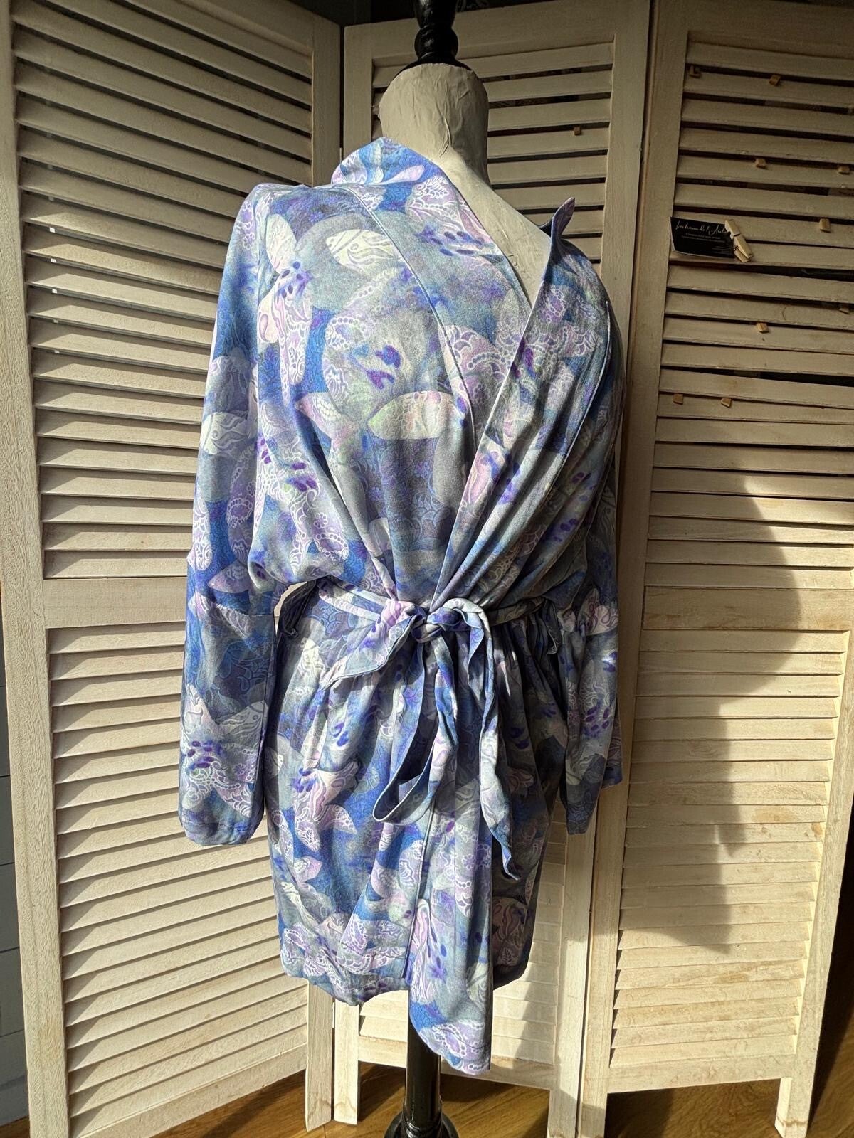 Son motif délicat dans les tons bleu, lilas et rose poudré apporte une touche poétique et raffinée. Une pièce idéale pour se sentir belle à la maison, en sortie détente ou comme vêtement d’intérieur chic.