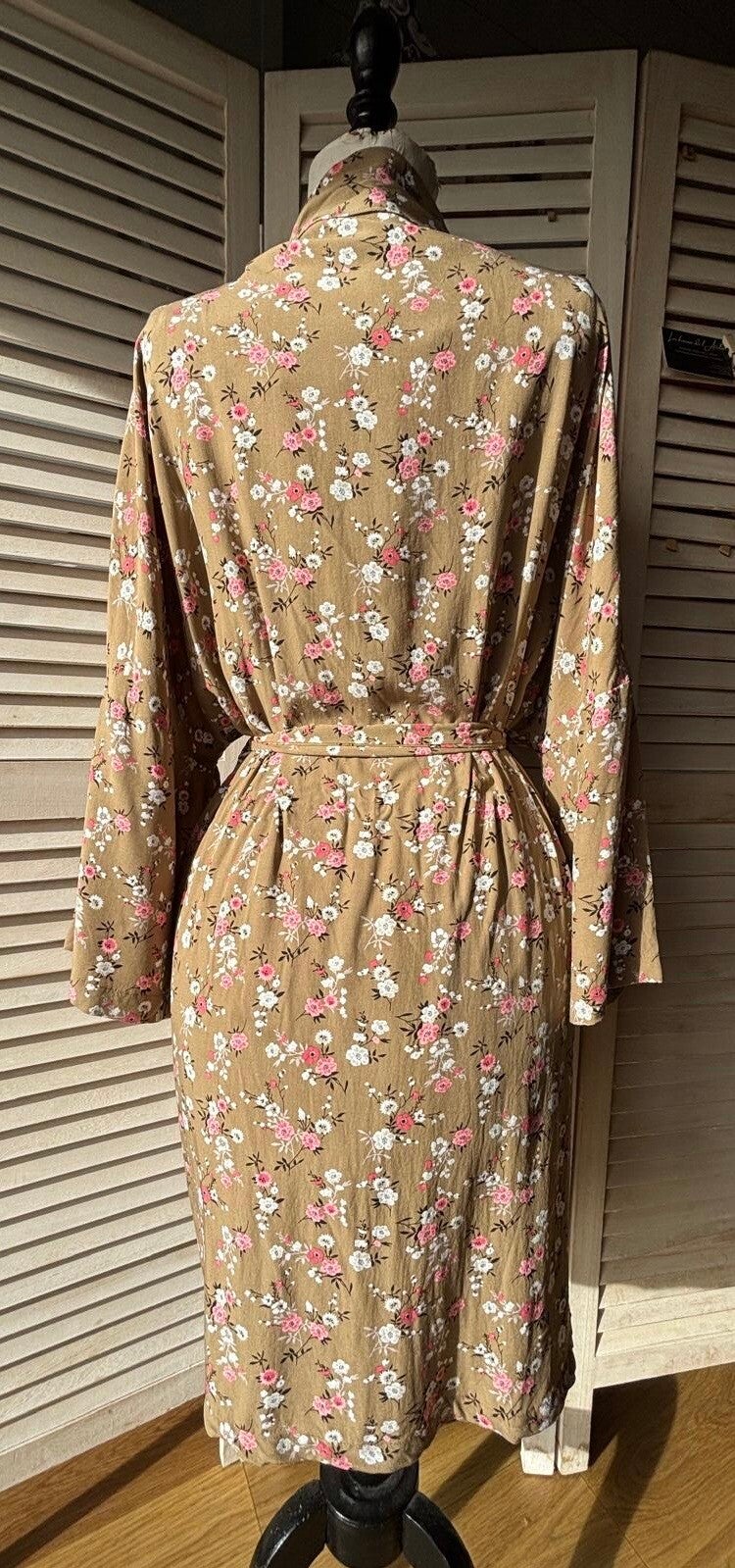 Découvrez Louisa, un kimono au charme délicat, confectionné en popeline de viscose, un tissu léger, doux et agréable à porter. Son imprimé fleuri dans les tons rosés et blancs sur fond camel offre un style romantique et intemporel.